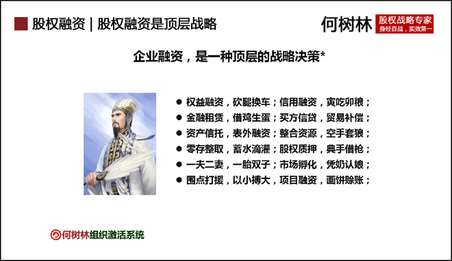 充分发挥股权的力量,实现融人、融资、融市场、融智慧、融资源,实现项目的快速发展。智慧的创业者,能够善用他人的力量,以股权作为最有力的杠杆,加速企业的发展。股权可以全方位的凝聚内部人才、市场渠道、资本方、行业平台,甚至竞争对手的力量。